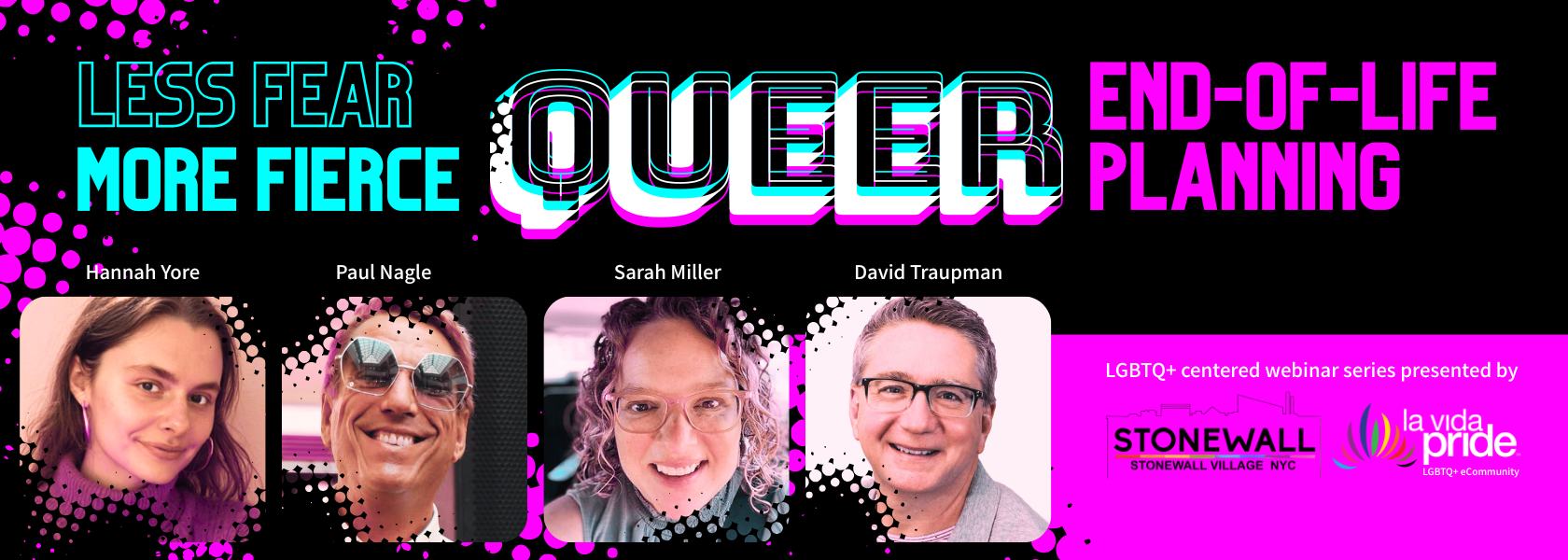 The webinar series brings together experienced voices from advocacy, hospice care, community leadership, and queer wellness. Open to LGBTQ+ individuals, chosen family members, caregivers, and allies seeking affirming, practical guidance around mortality, grief, spirituality, and legacy.